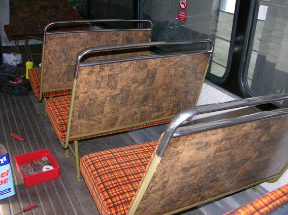 the full width back seat has already been fitted. The upper deck strip lights were removed, cleaned and the reflectors repainted white. Original plastic gaskets have also been fitted.