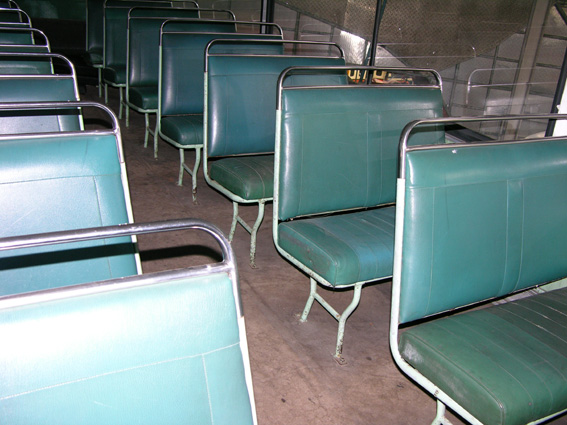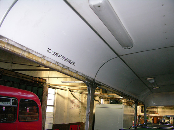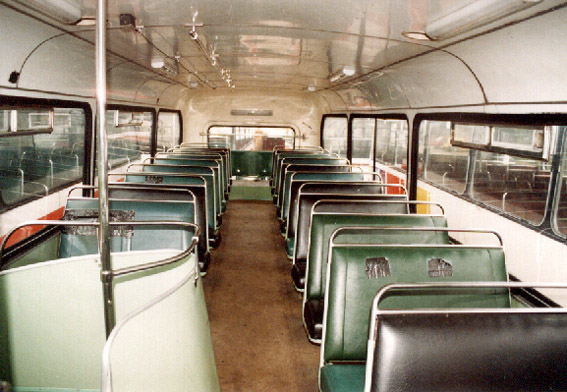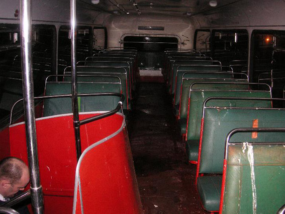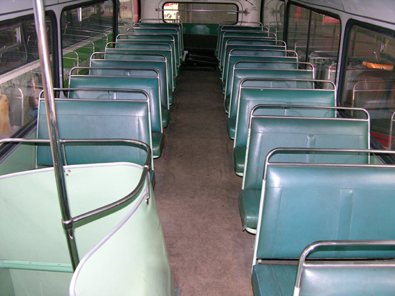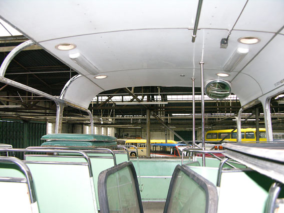 With the rear panels removed, there is quite an interesting view from the bonnet up through to the upper deck. You can see the heater matrices and the back seat cushion from below.
