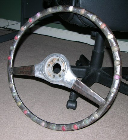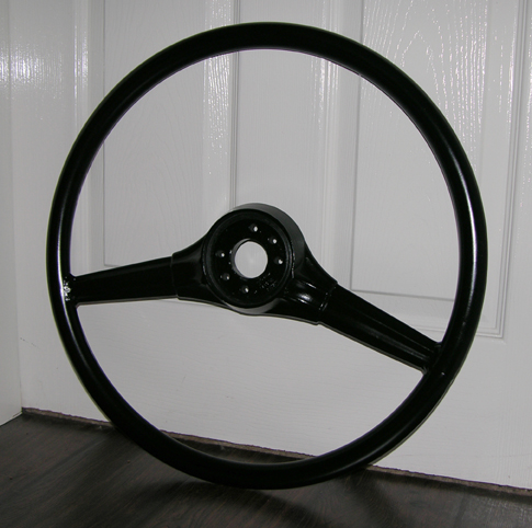 The steering wheel from LA510 cannot it seems be powder coated because of the plastic knobbles melting in the oven. Instead it has been sprayed with Plasticoat - the wheel would originally have been painted anyway.