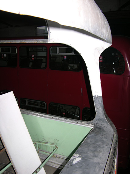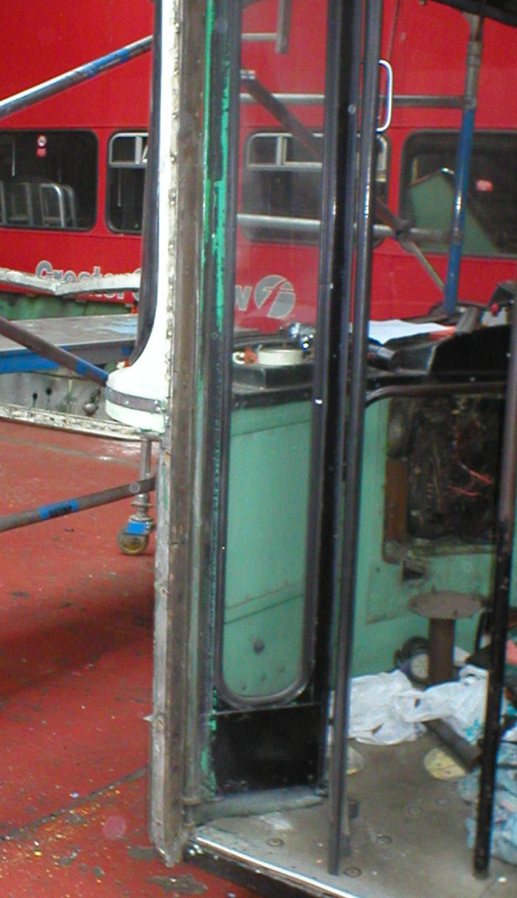 windscreen surround revealing several repairs which will need to be tidied up. The bus has knocked its fair share of high kerbs over the years and apart from fibreglass damage to the corner of the front panel, the pillar to which this is attached next to the door was bent and the aluminium panel